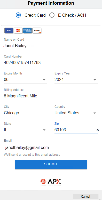 Complete the fields: Radio buttons ● Select the Credit Card option to display Card Information ● Select E-Check / ACH to enter Bank Account Information Some of the fields are populated with information retrieved from the primary client contact card. To edit this information enter text in the fields or select from the dropdowm menus. Click Submit. You are returned to the Payment dialog box and the new Credit Card (APX) or ACH (APX) appears in the Payment Method dropdown menu.