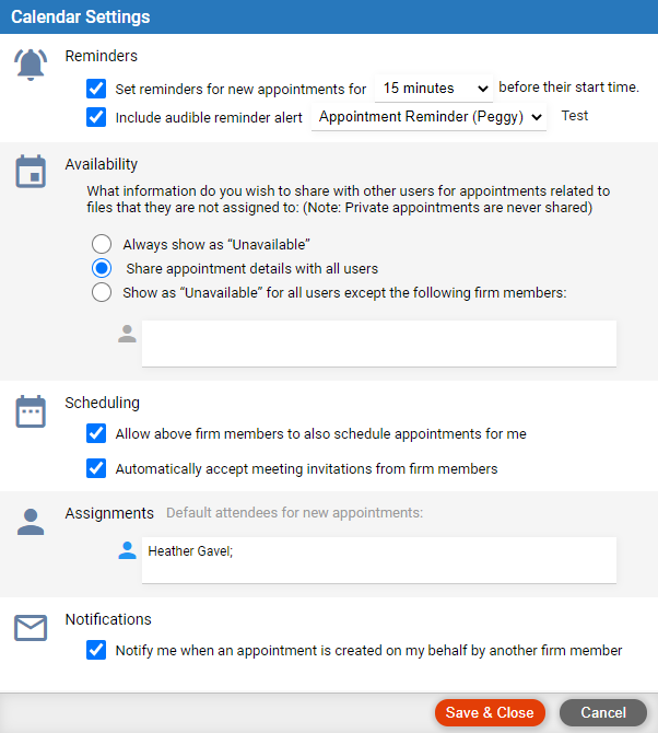 o Appointment reminder – Set in new appointments you create and, if so, remind attendees how long before the appointment starts.