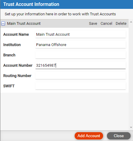 This type of bank account information is needed only if your firm has set up merchant processing—see How to set up merchant processing.