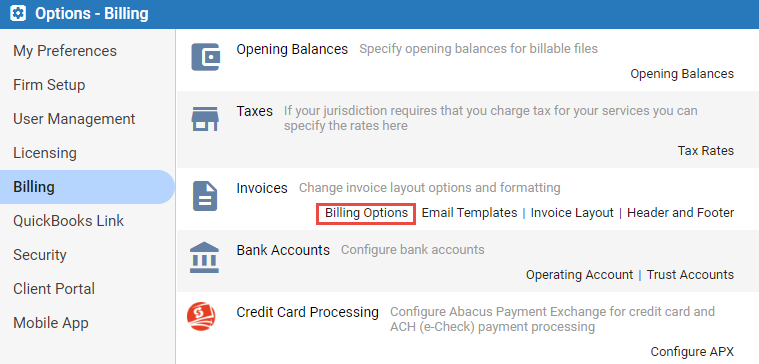Billing Options from the Invoices section.