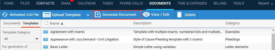 1. Select one in the list and click Generate Document. Or in the template editor, click Generate.